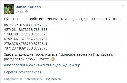 Вчера в сети появилось сообщение от бойцов Вооруженных Сил Украины, где были названы координаты заминированного места. В нем предлагается террористам расшифровать координаты и пойти разминировать место, которое указали «киборги». В составе добровольцев воюют ученые физики и творческие люди. Ответа от бандформирований пока не последовало.