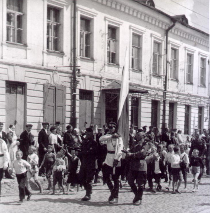 Русские фашистские формирования, созданные в период Второй мировой войны, использовали трехцветный флаг, в частности Русский Охранный Корпус и 1-я РНА генерала Смысловского. На фотографиях и видео, запечатлевших известное Пражское заседание КОНР 14 ноября 1944 г., отчетливо видно, что сцену украшают два огромных знамени: фашистской флаг со свастикой и Андреевский флаг. Так же документально зафиксировано использование трехцветного флага власовцами - парад 1-й Гвардейской бригады РОА во Пскове 22 июня 1943 г. Примечательно, что в 2014 году в Пскове под тем же флагом хоронили уже других фашистов-оккупантов, уничтоженных в Украине.