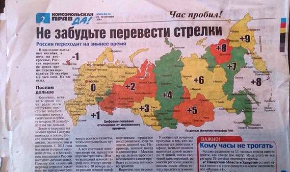 Редакция газеты "Комсомольская правда" совершила непростительную ошибку. В материале о переходе России на зимнее время издание забыло(?) о Крыме. Статья "Не забудьте перевести стрелки" проиллюстрирована картой РФ, на которой отсутствует аннексированный Крым.