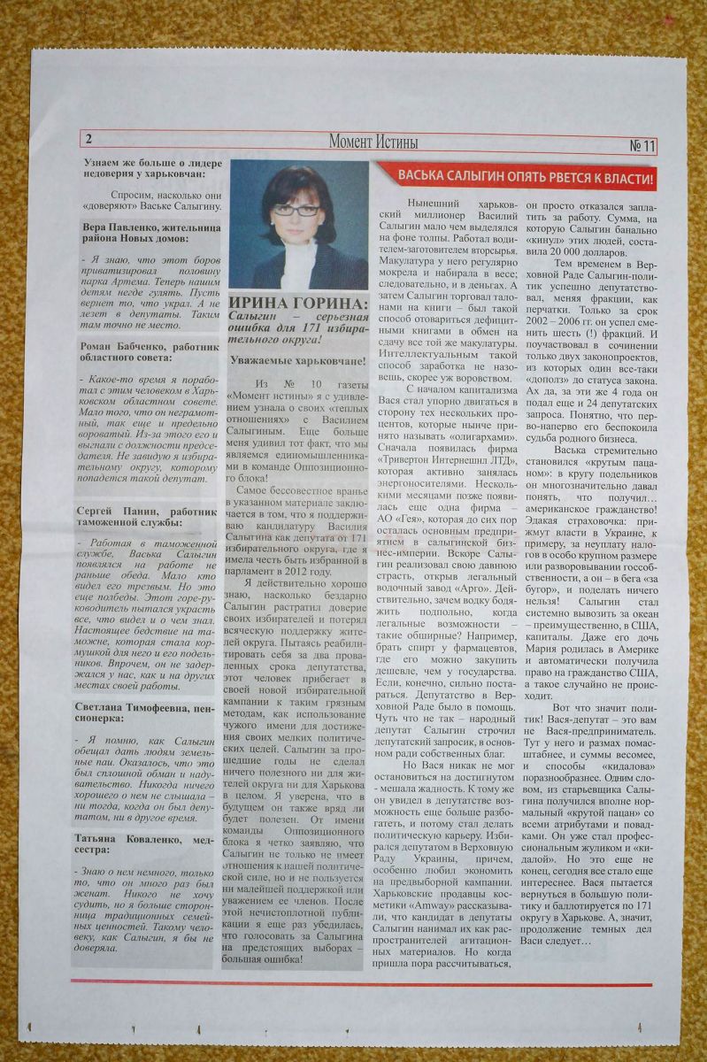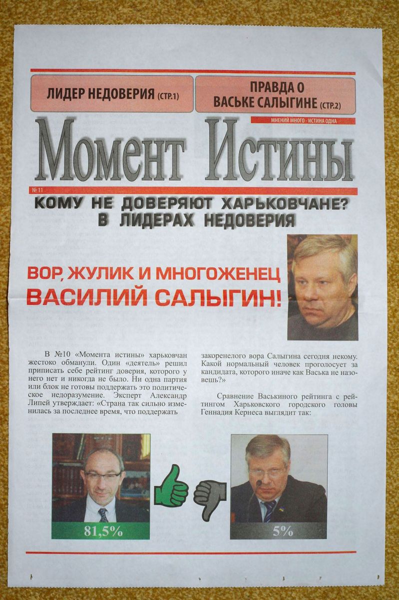 "Не питаю симпатий к Салыгину, но то, что делает Гепа - это мерзко и подло (впрочем, все, что делает Гепа - это мерзко и подло). Судя по этой акции, Салыгин (Василий Салыгин - кандидат-самовыдвиженец, экс-глава Харьковского облсовета — ред) представляет угрозу для Хомутынника (Виталий Хомутынник - в прошлом "регионал" из Макеевки, ныне - самовыдвиженец от Харькова, - ред), поэтому его "мочат", не разбирая средств. Только не от лица самого Хомутынника, а от лица "регионалки" Гориной, прошедшей в Раду по нашему округу два года назад. Ну, и Гепа не забыл попиариться, похваставшись своим нарисованным рейтингом", - сообщил "Главному" неравнодушный харьковчанин, добавив, что никаких выходных данных у газеты нет.