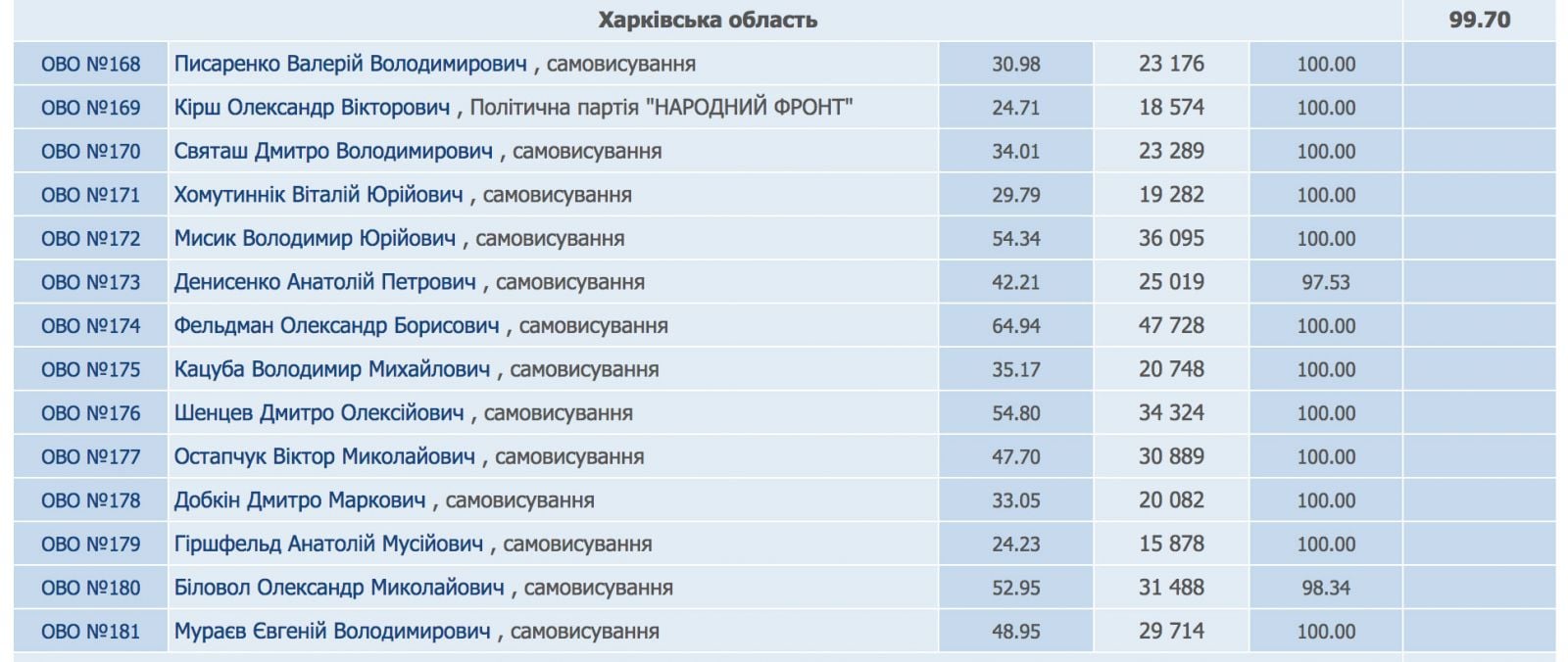 По результатам обработки 97,75% протоколов на внеочередных выборах в Верховную Раду Украины больше всего голосов избирателей у «Народного фронта» - 22,18%, затем идет «Блок Петра Порошенко» - 21,82%.
