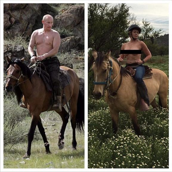 Телеведуча та актриса з США створила фотоколаж з двох світлин: фото Путіна з оголеним торсом на коні та своє власне, повідомляє Обозреватель з посиланням на The Daily Mail.