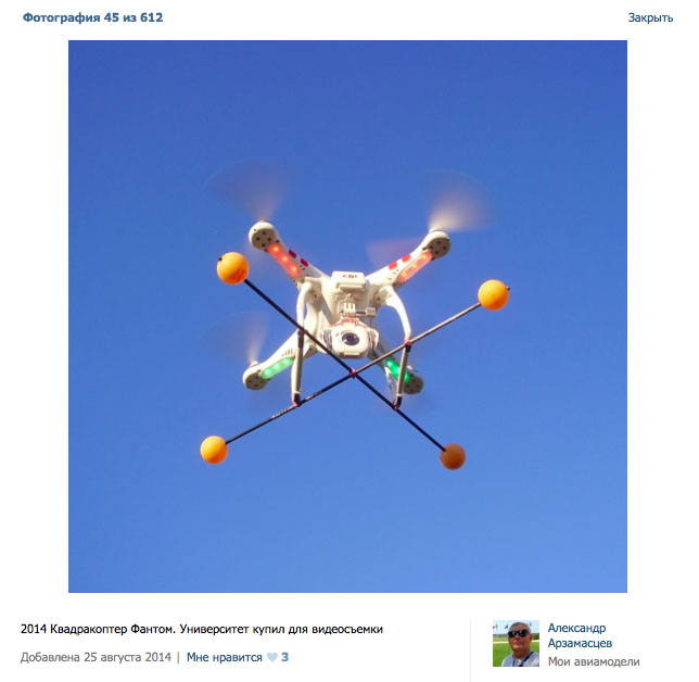 "Теперь перевожу на русский язык. Ребята взяли самую дешевую устаревшую модель китайского квадрокоптера DJI Phantom FC40, цена которой 20 тыс. руб. Присобачили зачем-то к ней страховочное шасси, отодрали логотипы производителя, назвали свой шедевр "Держава" и хотят продавать по 100 тыс. руб.", – уверен Варламов.