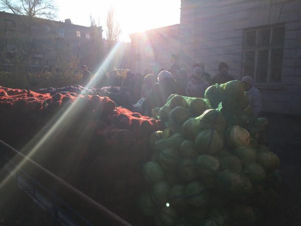 У "избиркомов" боевики выставили мешки с луком, свеклой, картофелем и другими овощами. Цена товара - одна гривна.