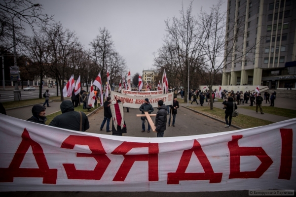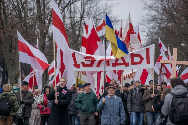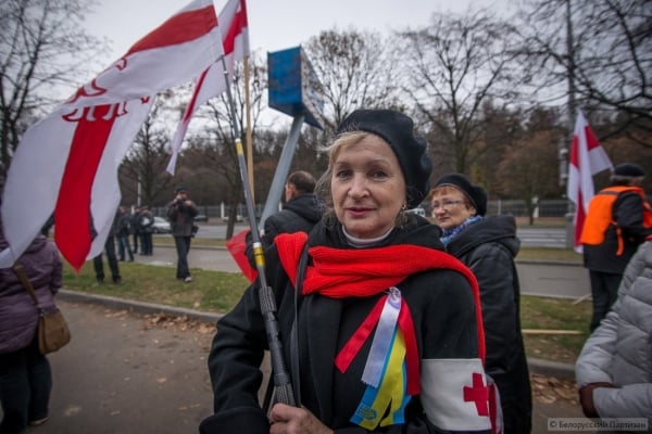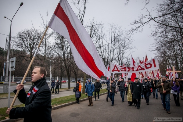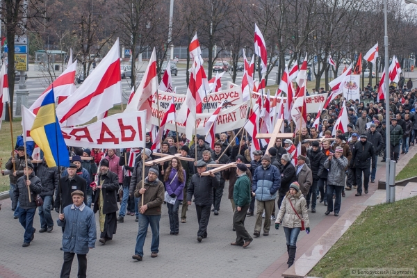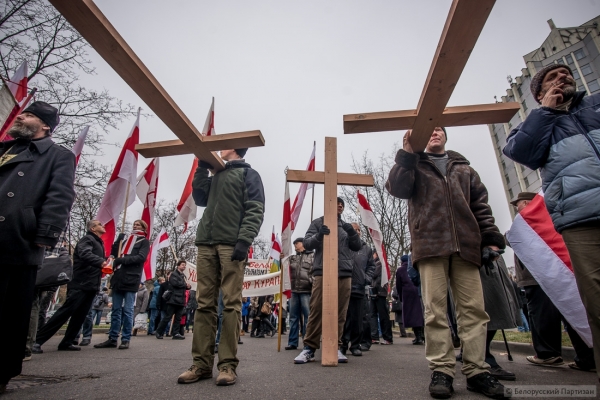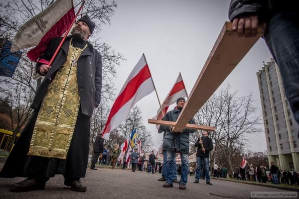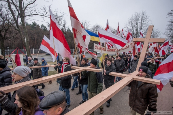 Люди принесли большие деревянные кресты, которые будут установлены в Куропатах после окончания шествия. Трижды прокричали «Жыве Беларусь» и двинулись колонной в сторону Куропат. Кроме национальных флагов - флаги КХП-БНФ, «Молодой Беларуси», БХД. В руках транспаранты «Дзяды» и «Ушануйма памяць продкаў».