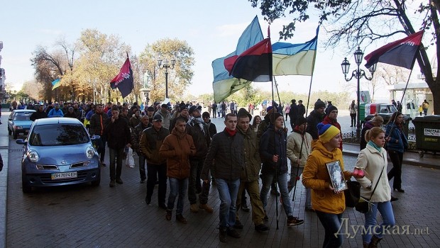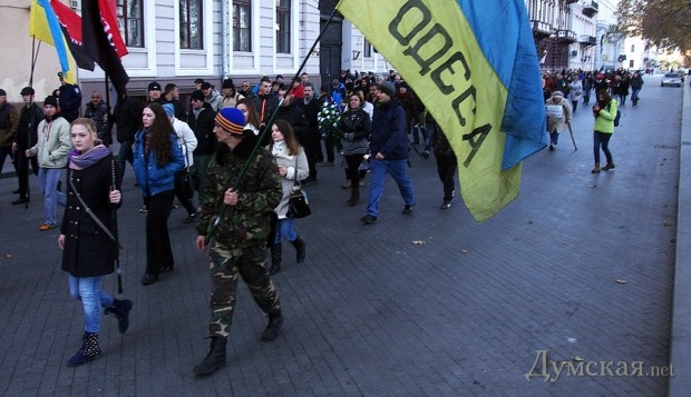 После митинга около сотни активистов прошлись по центральным улицам города. Они беспрепятственно добрались до Преображенской улицы, где возложили цветы.