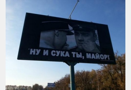 На фото, которые сделали очевидцы, видно надпись "Ну и с*ка ты, майор!".