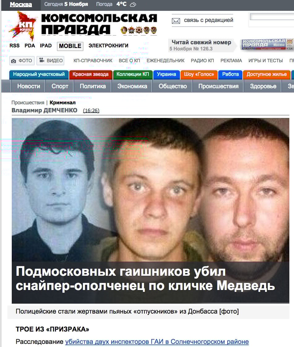 Как следует из ориентировки, распространенной УМВД по Красногорскому району, по подозрению в убийстве разыскиваются трое. 35-летний уроженец того же села Архангельское Михаил Константинов, а также два гражданина Украины — 26-летний Денис Константинов из Горловки (он однофамилец Михаила) и Денис Жуков 28 лет из Лисичанска. Изучение их профилей в соцсетях показало, что все трое участвовали в боевых действиях на юго-востоке Украины — сражались на стороне «ополчения».