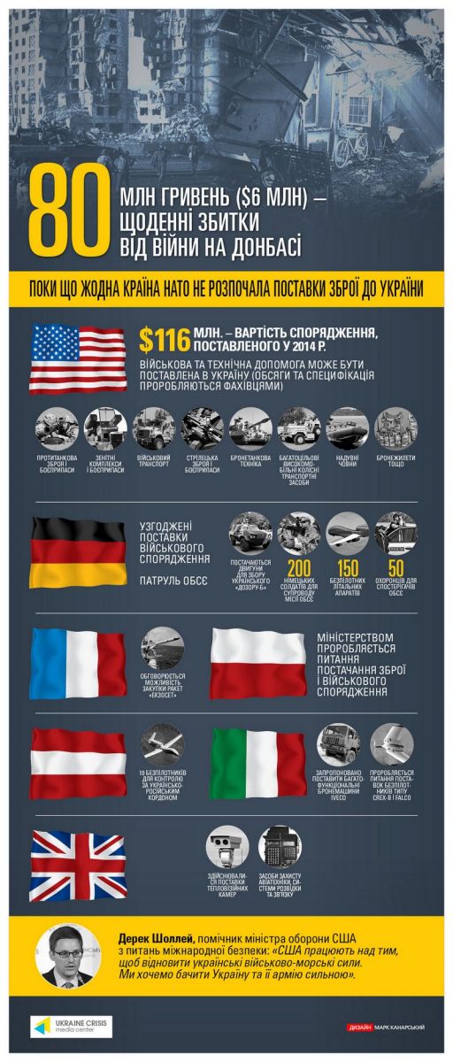 Согласно инфографике, подготовленной Украинским кризисным медиа-центром, Вооруженные силы Украины могут получить из США противотанковое оружие и боеприпасы, зенитные комплексы, военный транспорт, стрелковое оружие, бронетанковую технику, многоцелевые транспортные средства, надувные лодки и бронежилеты.