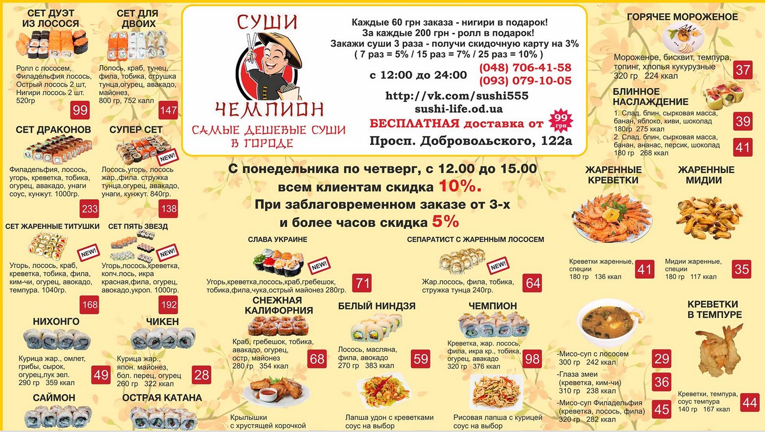 В меню одесского суши-бара «Чемпион» появились блюда с патриотическими названиями. Согласно информации на сайте заведения, посетители смогут попробовать роллы «Слава Украине», «Сепаратист с жареным лососем» и «Жареные титушки».