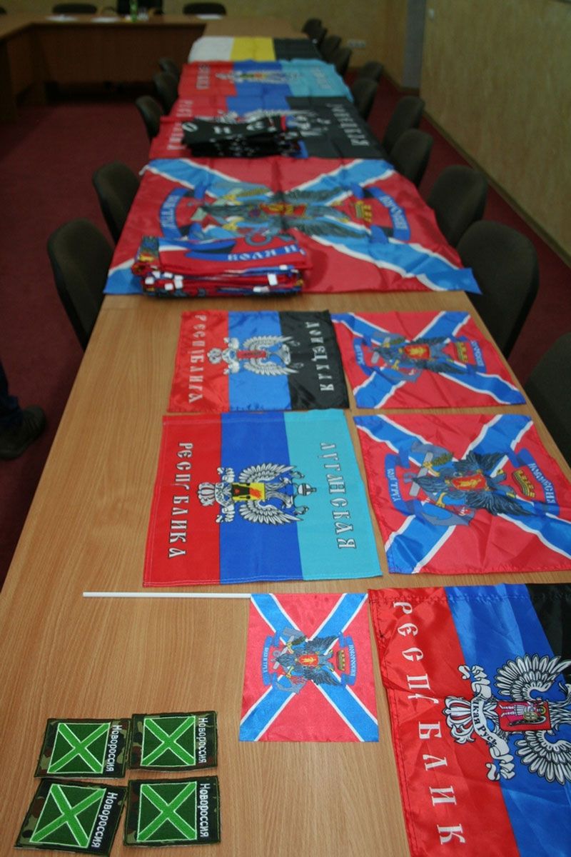 Во время обыска в квартире задержанного обнаружено и изъято большое количество флагов и флажков ДНР, ЛНР, шевронов, вымпелов, обложек для паспортов с символикой этих террористических организаций, имперские флаги России и т. д.