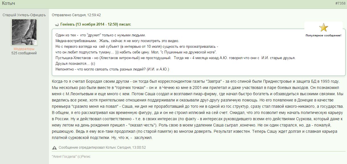 "Роль свою в моем удалении Саша сыграл ,конечно. Не он один старался, но, да - пожалуй, решающую. Ведь я ему все-таки продолжал (по старой памяти) во многом доверять. Результат известен. Теперь Сашу ждет долгая и славная карьера платной сурковской подстилки. Ну, что ж, - заслужил", - подытожил бывший "министр обороны" ДНР.