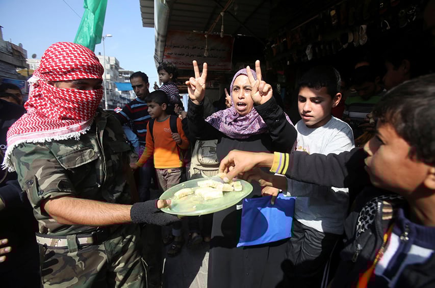 Палестинцы решили отпраздновать утренний кровавый теракт в Иерусалиме. Население Сектора Газа, среди которых женщины и дети, вышли на улицы поприветствовать весть о гибели израильтян в синагоге, людей угощают сладостями.