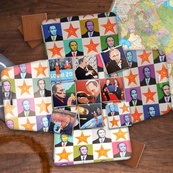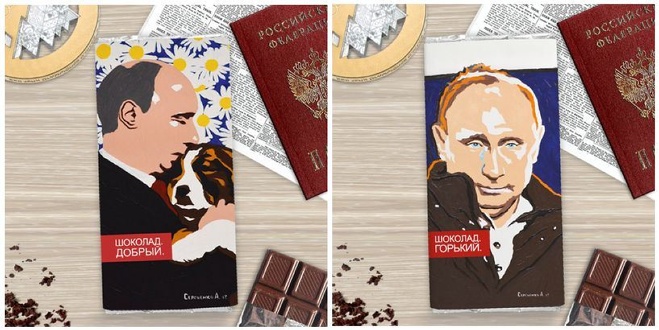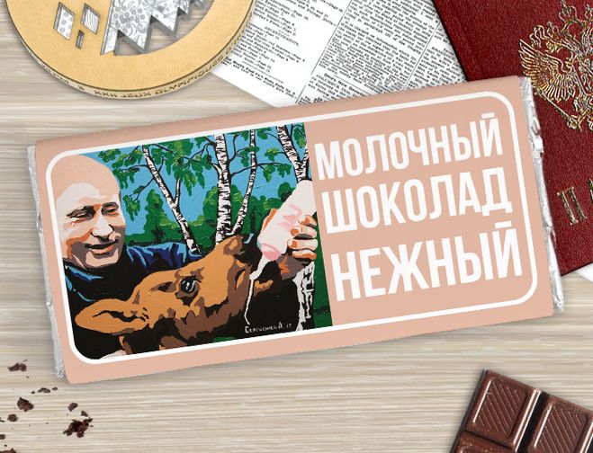 В екатеринбургских магазинах продают необычные шоколадки, на обертках которых изображен президент России Владимир Путин — на основе известной серии картин Алексея Сергиенко.