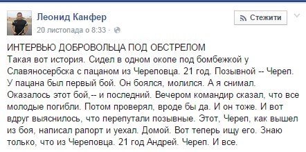 "Сидел в одном окопе под бомбежкой у Славяносербска с пацаном из Череповца. 21 год. Позывной -- Череп. У пацана был первый бой. Он боялся, молился", - написал Канфер на своей странице в Facebook.