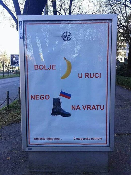 Российских дипломатов возмутили билборды, подписанные «черногорскими патриотами». На одном, в частности, приведены слова югославского писателя Милована Джиласа: «Никогда черногорцы и русские не были друзьями, мы всегда были для них разменной монетой». Другой плакат отсылает к словам посла РФ в Сербии Александра Чепурина, который якобы сравнил Черногорию с обезьяной, стремящейся в НАТО «в надежде получить банан». На билборде эмблема Североатлантического альянса сопровождается надписью «Лучше банан в руке, чем русский сапог на шее».