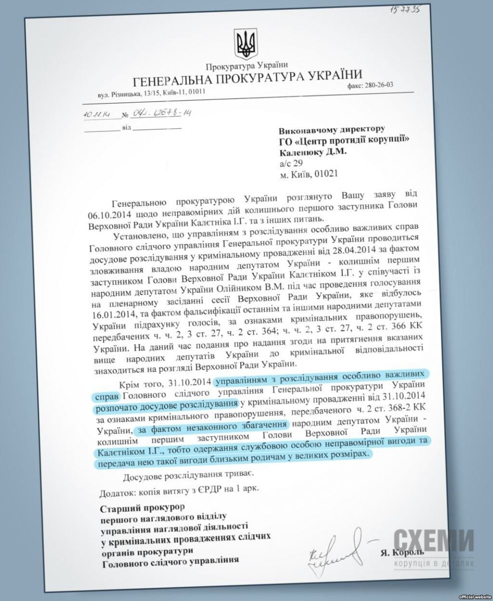 «Управлением по расследованию особо важных дел начато досудебное расследование по факту незаконного обогащения Калетником, то есть получение должностным лицом неправомерной выгоды и передача им такой выгоды близким родственникам в крупных размерах», - говорится в ответе прокуратуры на запрос Центра.