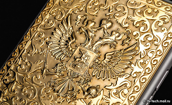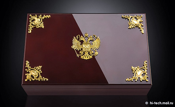 Цельное золотое панно, декорирующее корпус телефона, представляет собой композицию из орнаментов в стиле росписи и резьбы по дереву, получивших распространение в Великом Устюге в XV веке. Этот узор окружает барельеф государственного Герба Российской Федерации и надпись «Россия», исполненную в технике славянской вязи образца XV века.