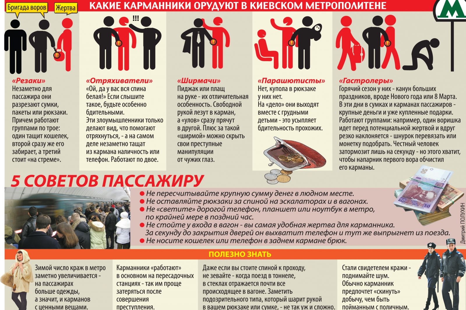 В киевском метрополитене орудуют пять видов карманников. Об этом сообщает "КП", где была опубликована соответствующая инфографика.