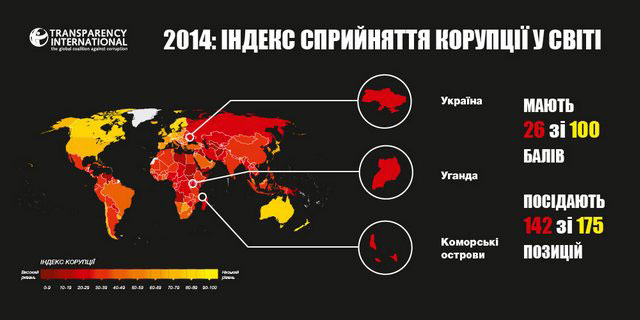 26 балів зі 100 можливих і 142 місце зі 175 позицій – такі показники України в цьогорічному Індексі сприйняття корупції (Corruption Perceptions Index) від Transparency International. Україна вчергове опинилась на одному щаблі з Угандою та Коморськими островами як одна з найбільш корумпованих країн світу.