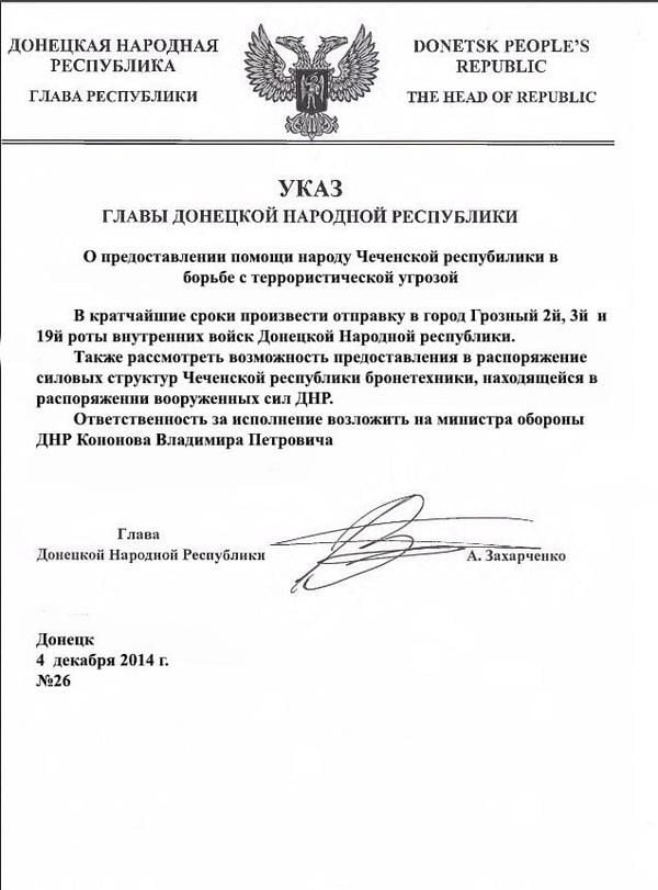 Т.н. "глава" ДНР Александр Захарченко распорядился отправить в Грозный (РФ, Чеченя) три роты боевиков. Об этом говорится в указе самозванца.