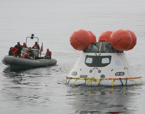 Корабли ВМФ США находились в районе посадки, чтобы с помощью водолазов поднять плавучую капсулу на борт.