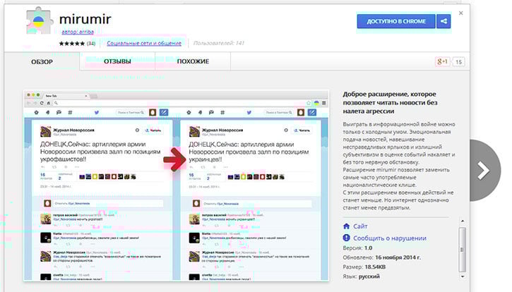 Группа харьковских разработчиков запустила миролюбивое приложение-словарь mirumir для браузера Google Chrome, которое автоматически заменяет во всех просматриваемых пользователем текстах агрессивные жаргонизмы словами с меньшей эмоциональной нагрузкой. Например, с этим расширением вместо слова «бандерлог» пользователь увидит в тексте слово «украинец», а «хунту» расширение заменит «властью». Как сообщает AIN.UA, таким образом, его создатели хотят сделать медиапространство менее заангажированым и снизить накал ненависти и агрессии в интернете.