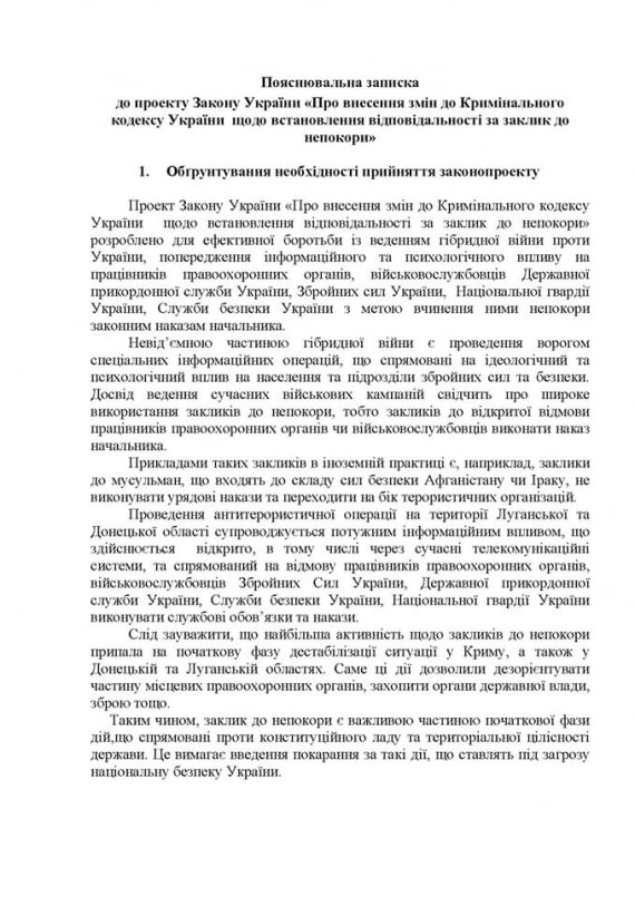 Как указано в пояснительной записке к законопроекту, он разработан для эффективной борьбы с ведением "гибридной войны против Украины, предупреждения информационного и психологического воздействия на сотрудников правоохранительных органов, военнослужащих Государственной пограничной службы, Вооруженных сил Украины, Национальной гвардии Украины, СБУ с целью совершения ими неповиновения законным приказам начальника ".