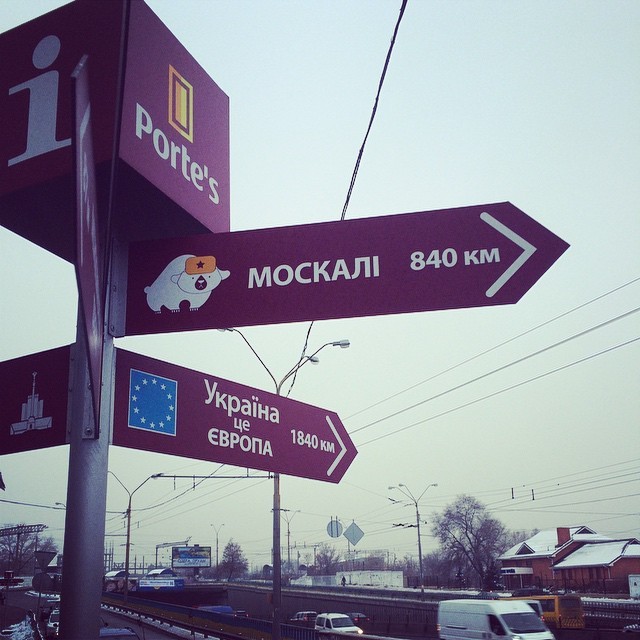 На стрелках указателя, в частности, размещены надписи "Москалі – 840 км", "Україна це Європа – 1840 км".