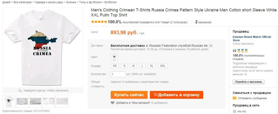 И, что самое забавное – доставка в Российскую Федерацию бесплатно! Берегитесь, футболочки с «Искандерами» и «Тополями» – тенденции меняются, аннексированный Крым от китайских братьев на подходе, всего за 893,98 рублей!