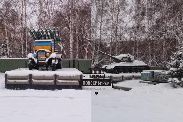 Неизвестные разрисовали в цвета украинского флага два экспоната на Монументе славы в Новосибирске.