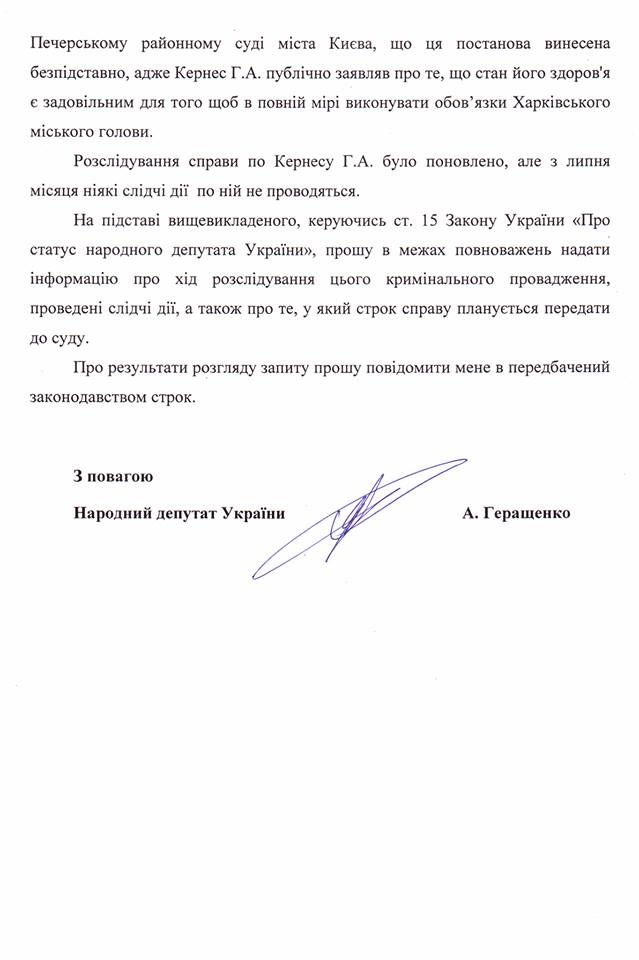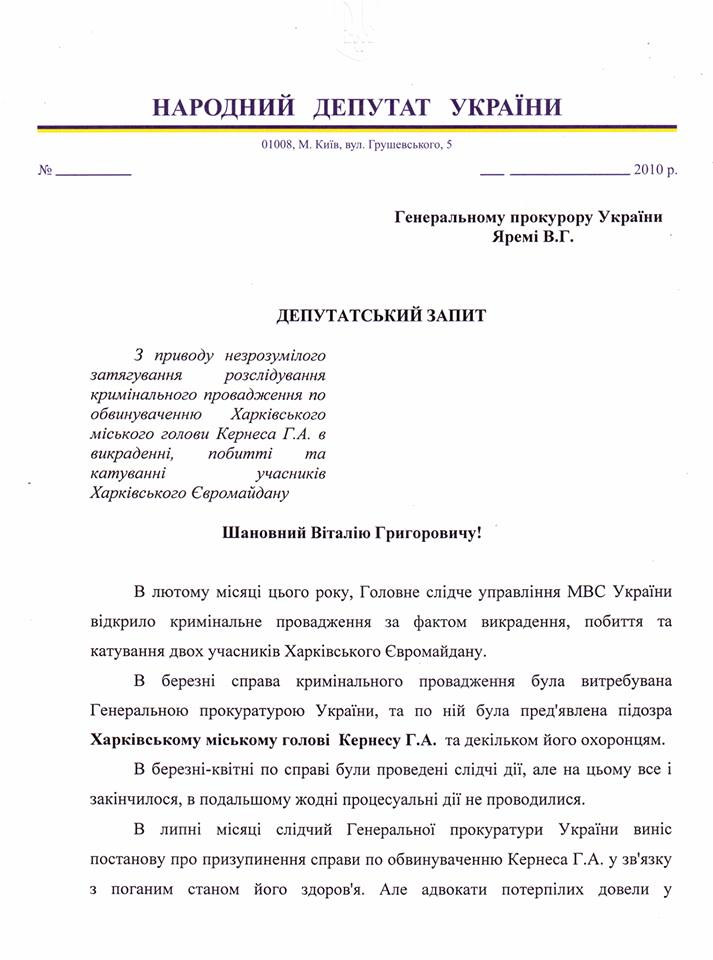 Сегодня Верховная Рада поддержала запрос к Генеральному прокурору Украины Виталию Яреме с требованием разъяснить, причины затягивания расследования дела по подозрению харьковского городского головы Кернеса в похищении, избиении и пытках активистов Евромайдана.