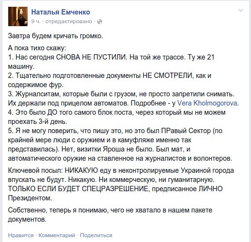 "Нас сегодня снова не пустили. На той же трассе. Ту же 21 машину. Тщательно подготовленные документы не смотрели, как и содержимое фур. (…) Это был Правый Сектор (по крайней мере люди с оружием и в камуфляже именно так представилась)", - написала Емченко в Facebook.