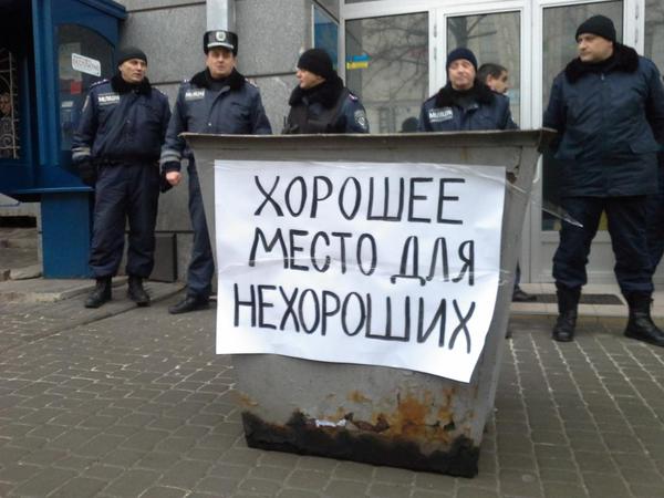 Несколько парней в камуфляже без опознавательных знаков (там было много таких) принесли мусорный бак и установили его аккурат перед входом департамент. Прилепили к баку плакат «Хорошее место для нехороших» и бросили внутрь петарды. Дымило красиво. Гремело громко. Взвыли автосигнализации. Зазвучали революционные песни, передает корреспондент Главного с места событий.