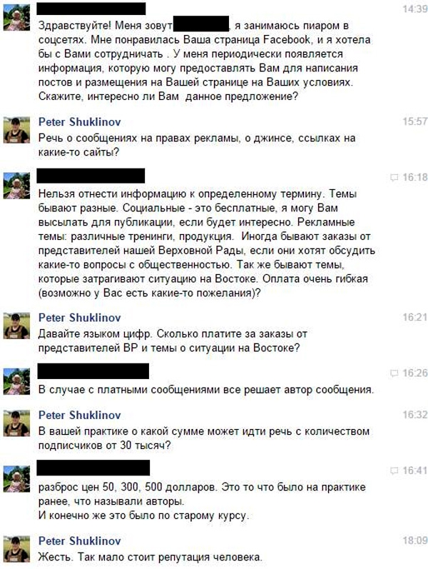 Скрин переписки журналист опубликовал с комментарием: «Все покупается и продается. Особенно если речь идет об "opinion leaders" в FB. Репутация людей, на которых вы подписаны, оценивается в $50-500. Если верить этой женщине, то некоторые авторы уже продали свою честь (за 50, 300, 500 долларов). Вы уверены, что когда читаете какого-то человека в FB, то с вами делятся мыслями, а не промывают мозги за деньги кукловодов? Будьте внимательны. Доверяйте людям, но всегда помните, что они алчны и запросто могут конвертировать ваше доверие в баксы. Имя вербовщика убрал, чтобы этой записью не помогать ей "клиентскую" базу пополнять. Пойду руки помою».