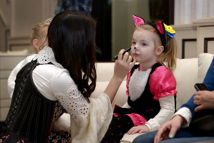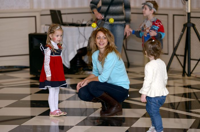 Пчелка Джул, в миру Юля Пиненова на празднике с трехлетней Ульяной. Малышка требует, чтобы мама всегда рядом была, рука в руке.