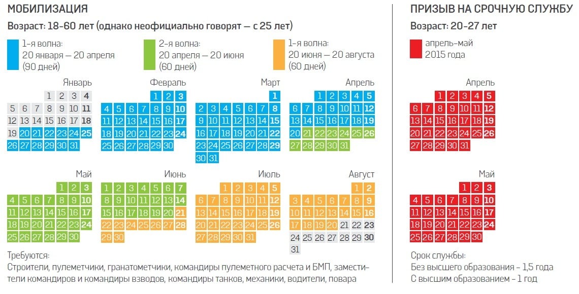 Новоназначенный глава СНБО Александр Турчинов официально анонсировал - в 2015 году будет минимум три волны мобилизации, а также возобновят призыва на срочную службу. Возраст срочников сдвигается - служить возьмут с 20 до 27 лет, а не с 18 до 25 как ранее.