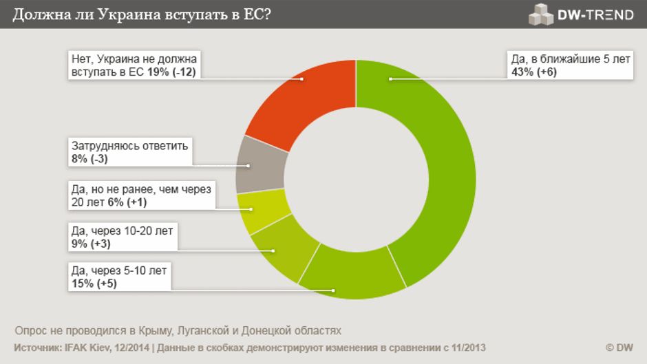 73 процента жителей Украины поддерживают идею вступления страны в Евросоюз, причем, более половины - 58 процентов - хотят, чтобы это произошло в ближайшие десять лет. Лишь 19 процентов населения высказались против членства Украины в ЕС. При этом доля сторонников и противников этого шага на западе и востоке страны практически одинакова. Таковы результаты репрезентативного опроса DW-Trend, который по заказу медиакомпании DW провело киевское отделение Института изучения общественного мнения IFAK.