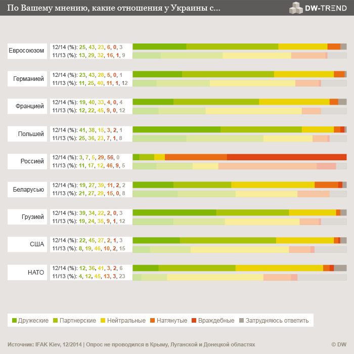 В целом социологи констатировали резкий рост симпатий ко всем западным странам и организациями. Так, две трети респондентов назвали украино-германские отношения дружественными и партнерскими. Это более чем на 30 процентных пунктов выше, чем год назад. 68 процентов столь же высоко оценили отношения Украины с Европейским Союзом. В ноябре 2013 года такого мнения придерживались лишь 42 процента.