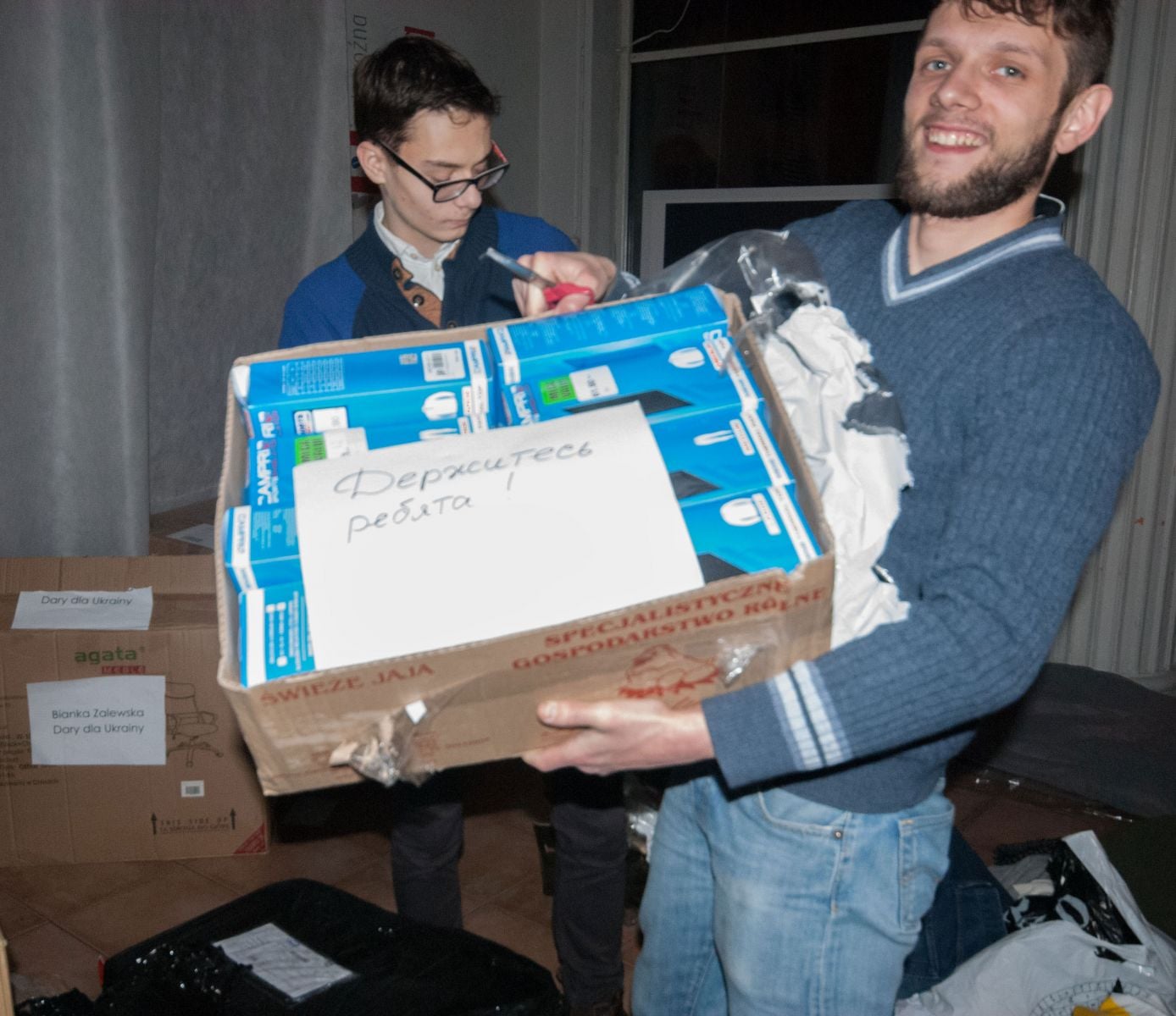 - Для військових теплі речі було закуплено за кошти, зібрані завдяки нашому проекту bronezhylety.com. Це публічна збірка, яку було створено для оснащення українських військовослужбовців та Національної гвардії основними заходами безпеки для захисту життя і здоров’я. Теплі речі для вимушених переселенців приносили люди. Там є також листівки, записки і новорічні подарунки – адже наближаються свята, і поляки переказували українцям не тільки матеріальну, але й духовну підтримку», - розповідає Наталя Панченко з «Відкритого Діалогу», координатор проекту «Бронежилети».