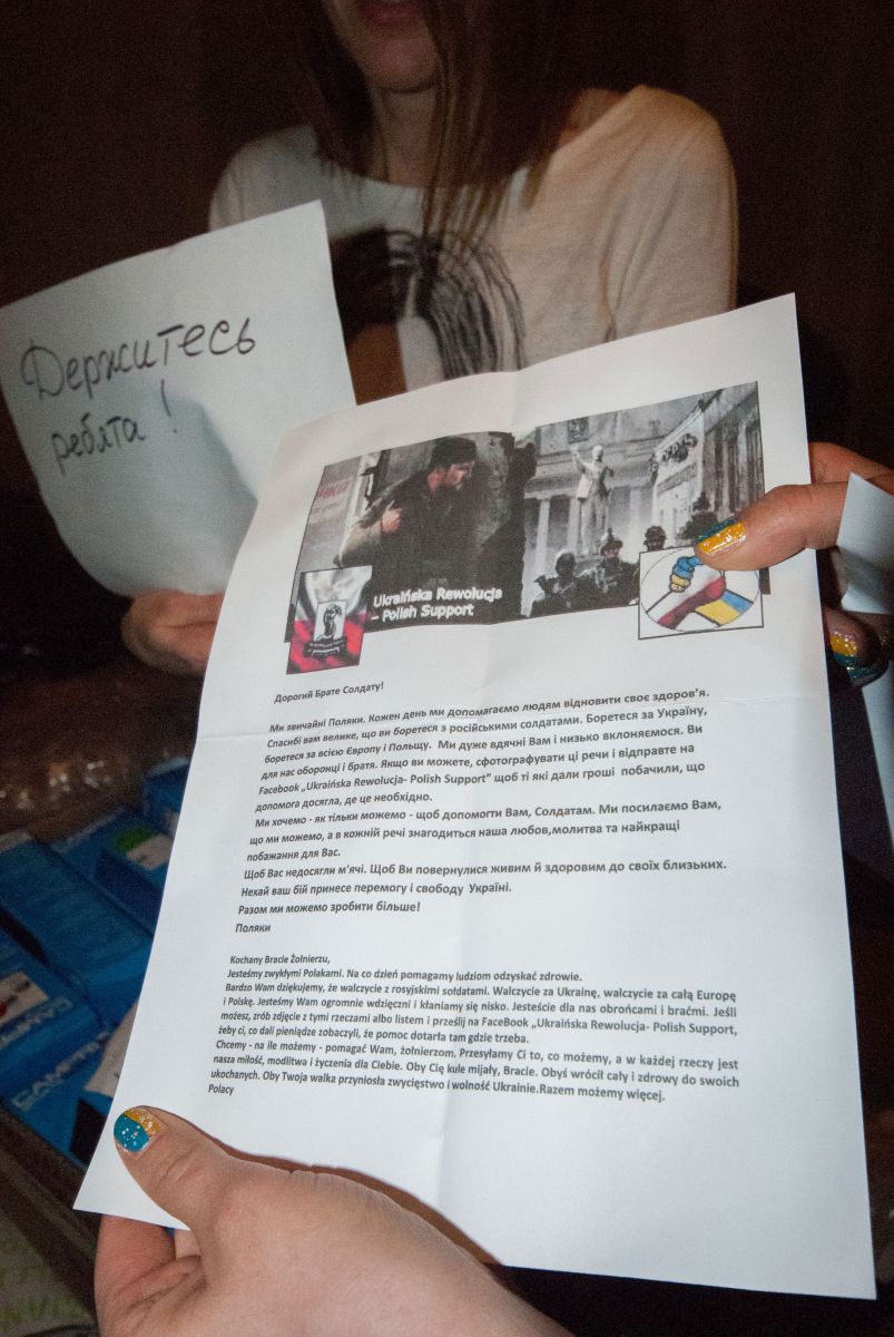 В одному із таких новорічних листів, вкладених до пакунків з допомогою, говориться: «Дорогий Брате Солдате! Ми звичайні поляки. Кожен день ми допомагаємо людям відновити своє здоров’я. Спасибі вам велике, що ви боретеся з російськими солдатами. Боретеся за Україну, за всю Європу і Польщу. Ми дуже вдячні вам і низько вклоняємося. Ви для нас оборонці і браття. […]Ми посилаємо вам, що можемо, а в кожній речі знаходиться наша любов, молитва та найкращі побажання для вас».