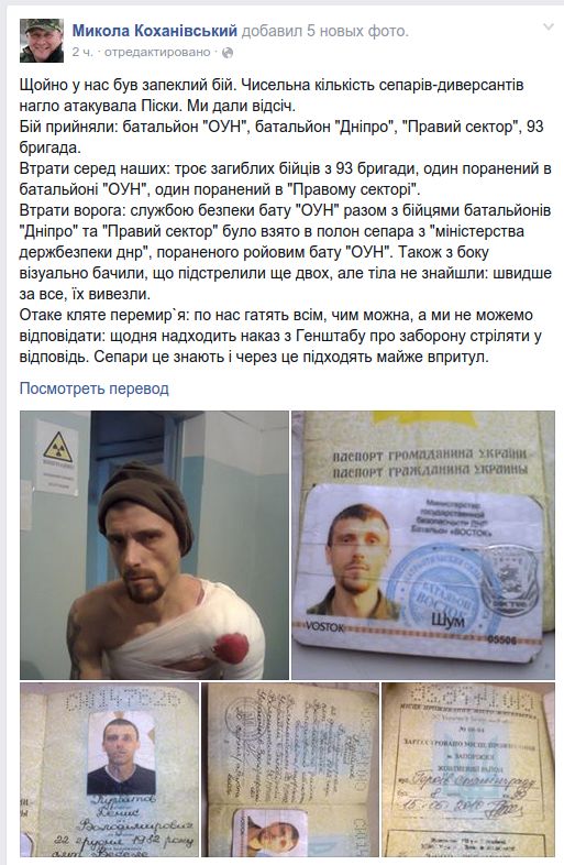 "Только что у нас был ожесточенный бой. Большое количество сепаратистов-диверсантов нагло атаковало Пески. Мы дали отпор. Наши потери: трое погибших бойцов из 93 бригады, один раненый в батальоне "ОУН", один раненый в "Правом секторе", - написал Кохановский.
