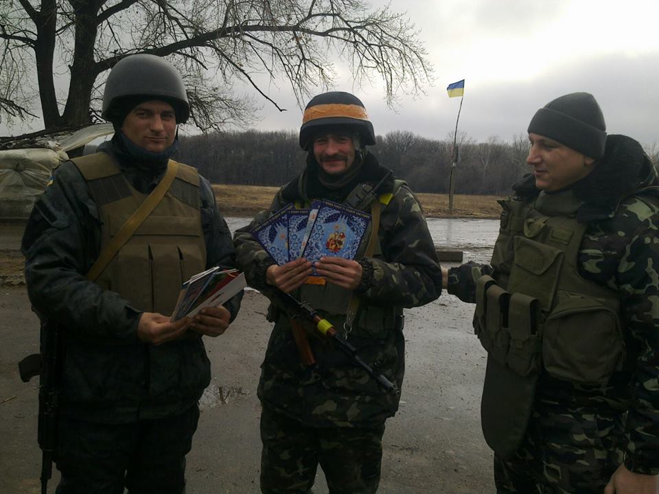 В преддверии новогодних праздников офицеры Национальной гвардии Укрианы вручили военнослужащим в зоне АТО открытки, которые специально для бойцов подготовили студентки кафедры телерепортерского мастерства Харьковской государственной академии культуры.
