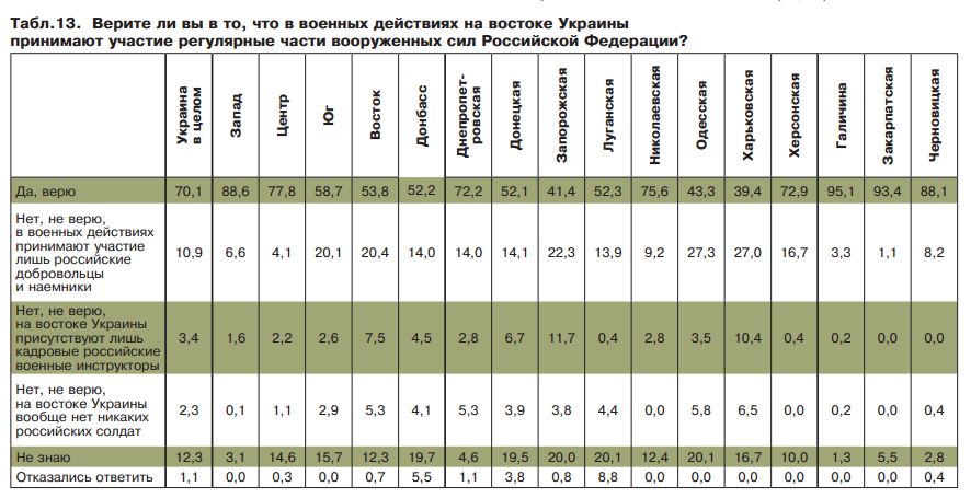 В то, что никаких россиян (ни бойцов регулярных частей, ни военных инструкторов, ни наемников, ни добровольцев) на Донбассе нет, считает только 2,3% населения. Больше всего таких «доверчивых» (прогнозируемо) в Харьковской области — 6,5%.