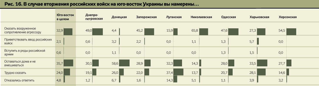 Жителям восьми областей Юго-Востока был адресован прямой вопрос — социологи интересовались их реакцией на возможное вторжение российских войск. Наиболее популярный ответ — «Оставаться дома и не вмешиваться» — 35,7%. Подобного мнения придерживаются 58,6% опрошенных жителей Донетчины. И (для сравнения) всего лишь 14,3% жителей Николаевщины.