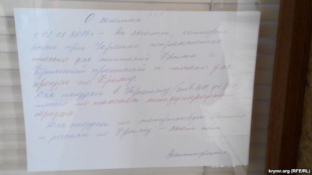 «С 1.01.2015 все льготы, которые были при Украине, сохраняются только для жителей Крыма с крымской пропиской и только для проезда по Крыму. Для поездки в Украину (ветеранам и участникам ВОВ) – только по талонам международного образца. Для поездки на материковую Россию и россиян по Крыму – льгот нет», – говорится в объявлении.
