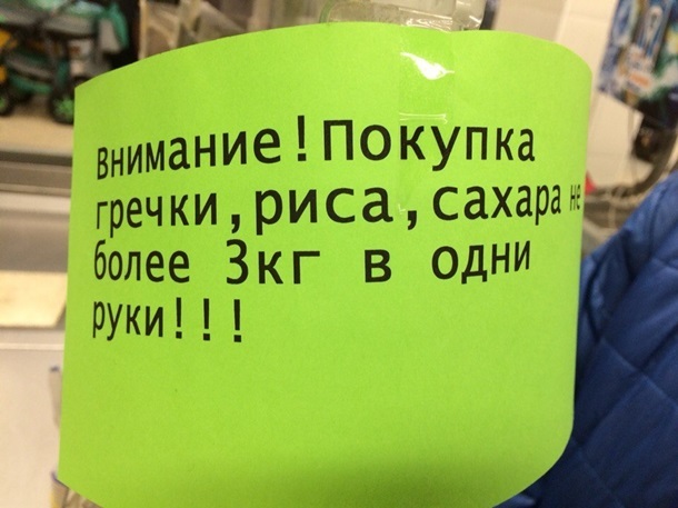Соответствующие объявления появились на кассах магазина: "Внимание! Покупка гречки, риса, сахара не более 3 кг в одни руки!".