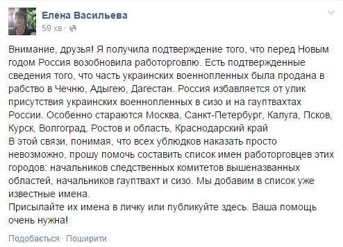"Россия избавляется от улик присутствия украинских военнопленных в сизо и на гауптвахтах России. Особенно стараются Москва, Санкт-Петербург, Калуга, Псков, Курск, Волгоград, Ростов и область, Краснодарский край", - написала Васильева.
