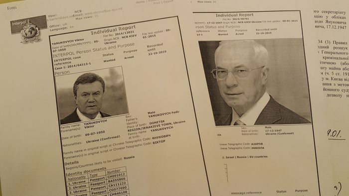 Объявлены в международный розыск Интерпола ( красная карточка -задержание для экстрадиции в Украину): Янукович Виктор Федорович, Янукович Александр Викторович, Азаров Николай Янович, Багатырева Раиса Васильевна, Колобов Ю. В. ( экс министр финансов Украины), Дзекон Г.Б. ( экс руководитель Укртелекома).