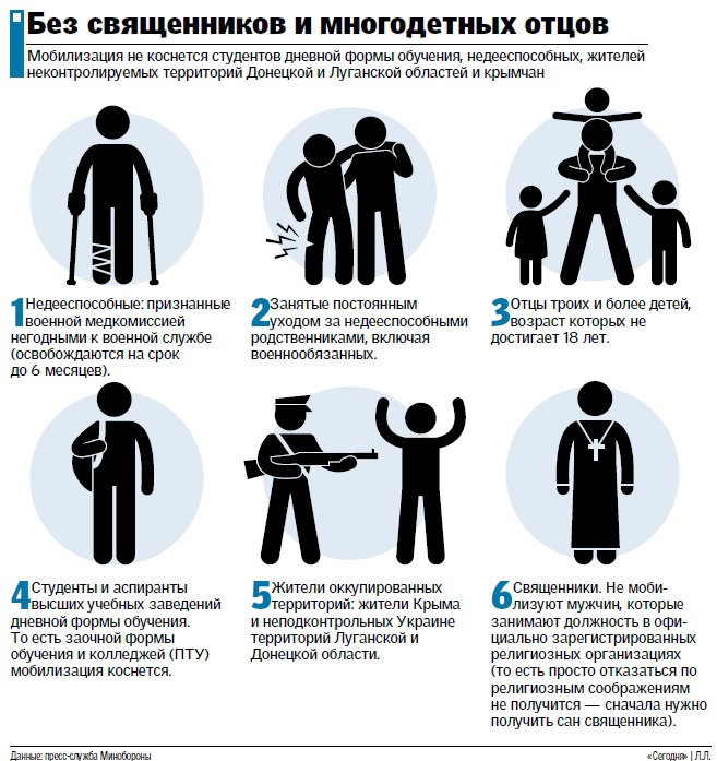 "ПО ЖЕЛАНИЮ". Есть только шесть категорий украинцев, которых точно не возьмут на войну (см. инфографику), говорит Буряченко: "Священников мобилизируем только по желанию. Мобилизировать многодетных отцов, инвалидов и тех, кто за ними ухаживает, не будем. Да и жителей оккупированных территорий не возьмем. Как мы их заберем, когда они там?" Стремящихся на фронт останавливать не будут, но военкомат проверит, действительно ли вы будете полезны. "Пойти на войну может любой желающий: если медкомиссия подтвердит, что человек не инвалид, разве мы против? Но нужна также соответствующая подготовка или специализация", — отмечает Буряченко.